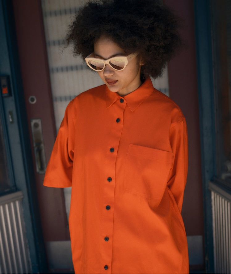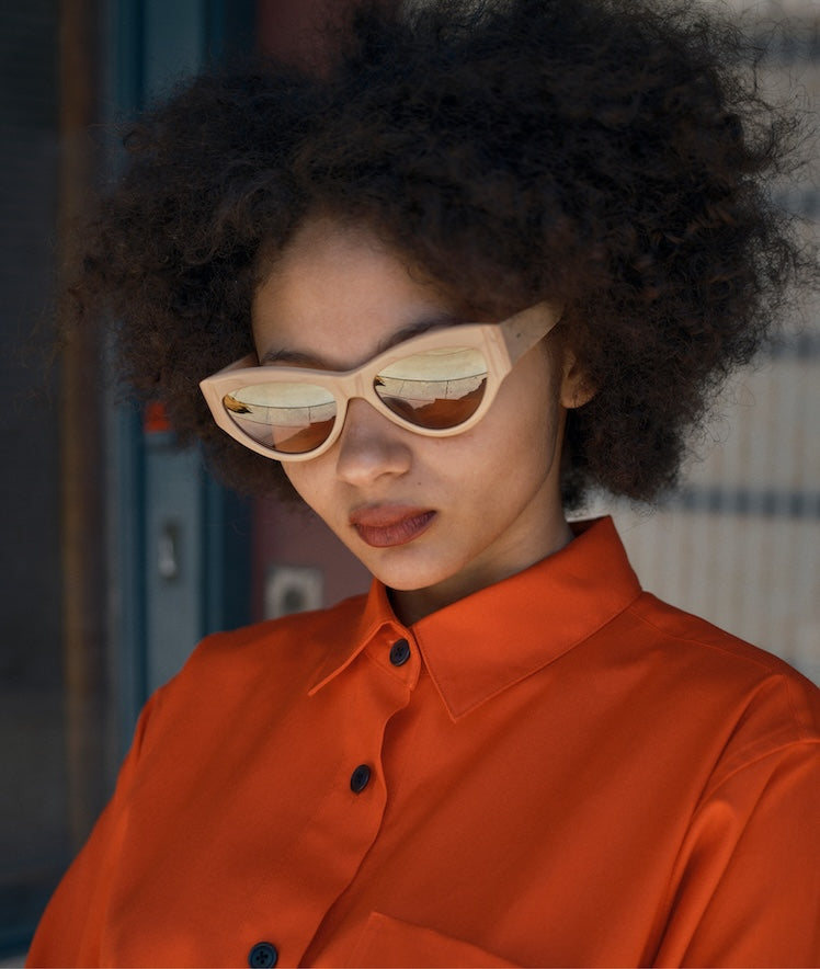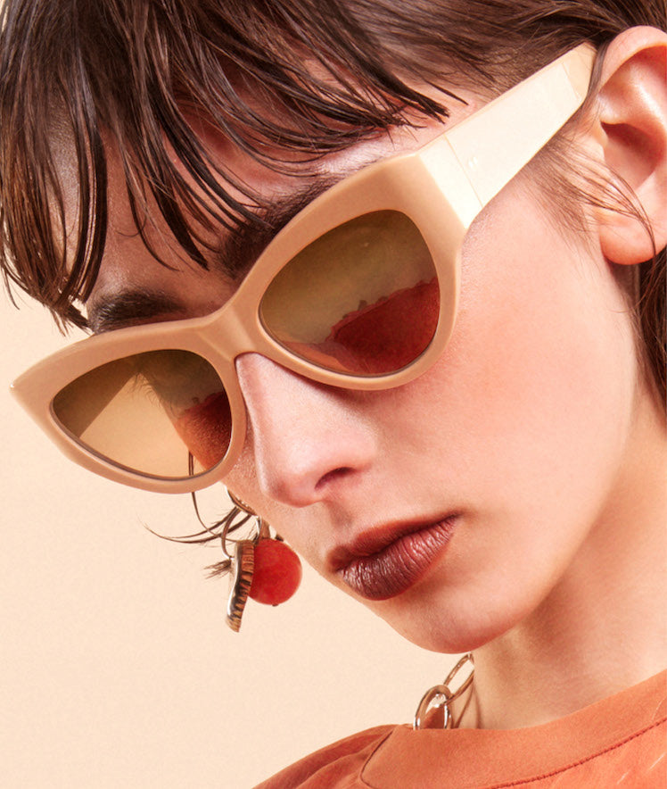 Upcycled + earth-conscious ecru Italian acetate frame with bio nylon bronze mirror lens offering 100% UVA+UVB protection.