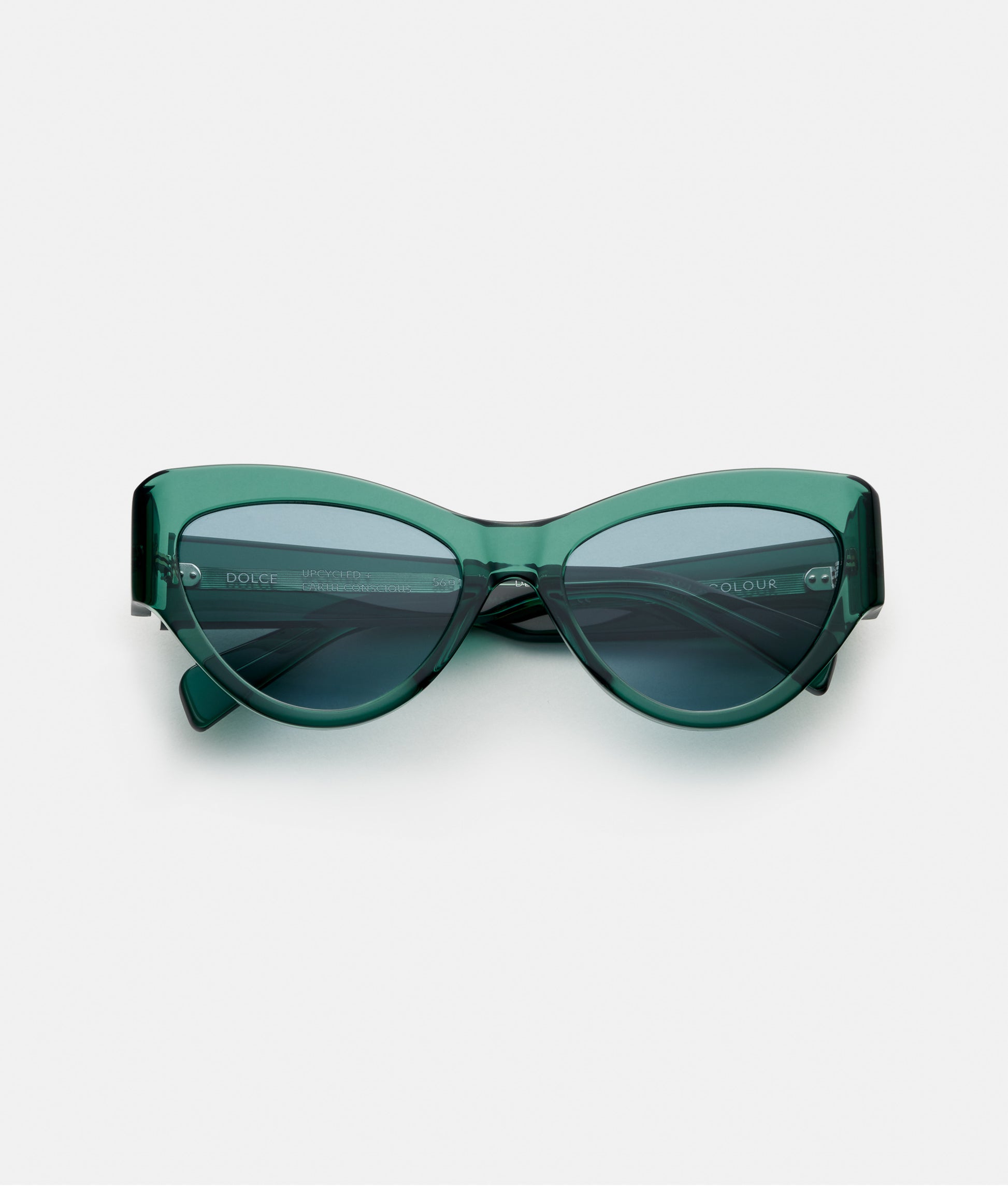 Upcycled + earth-conscious green Italian acetate frame with bio nylon teal lens offering 100% UVA+UVB protection.