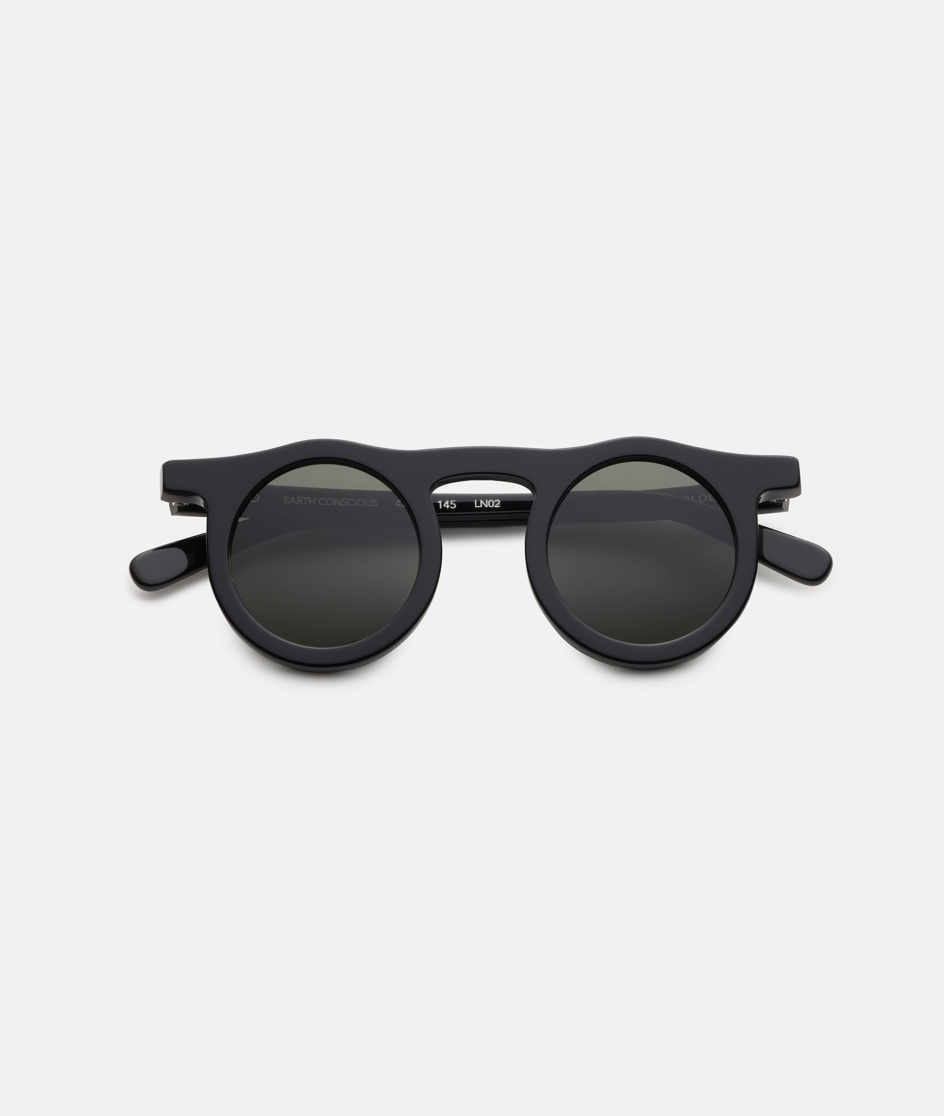 Earth-conscious gloss black Italian acetate frame with bio nylon dark-grey lens offering 100% UVA+UVB protection.