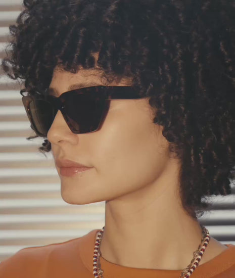 Earth-conscious Italian tort acetate frame with bio nylon dark-brown lens offering 100% UVA+UVB protection.