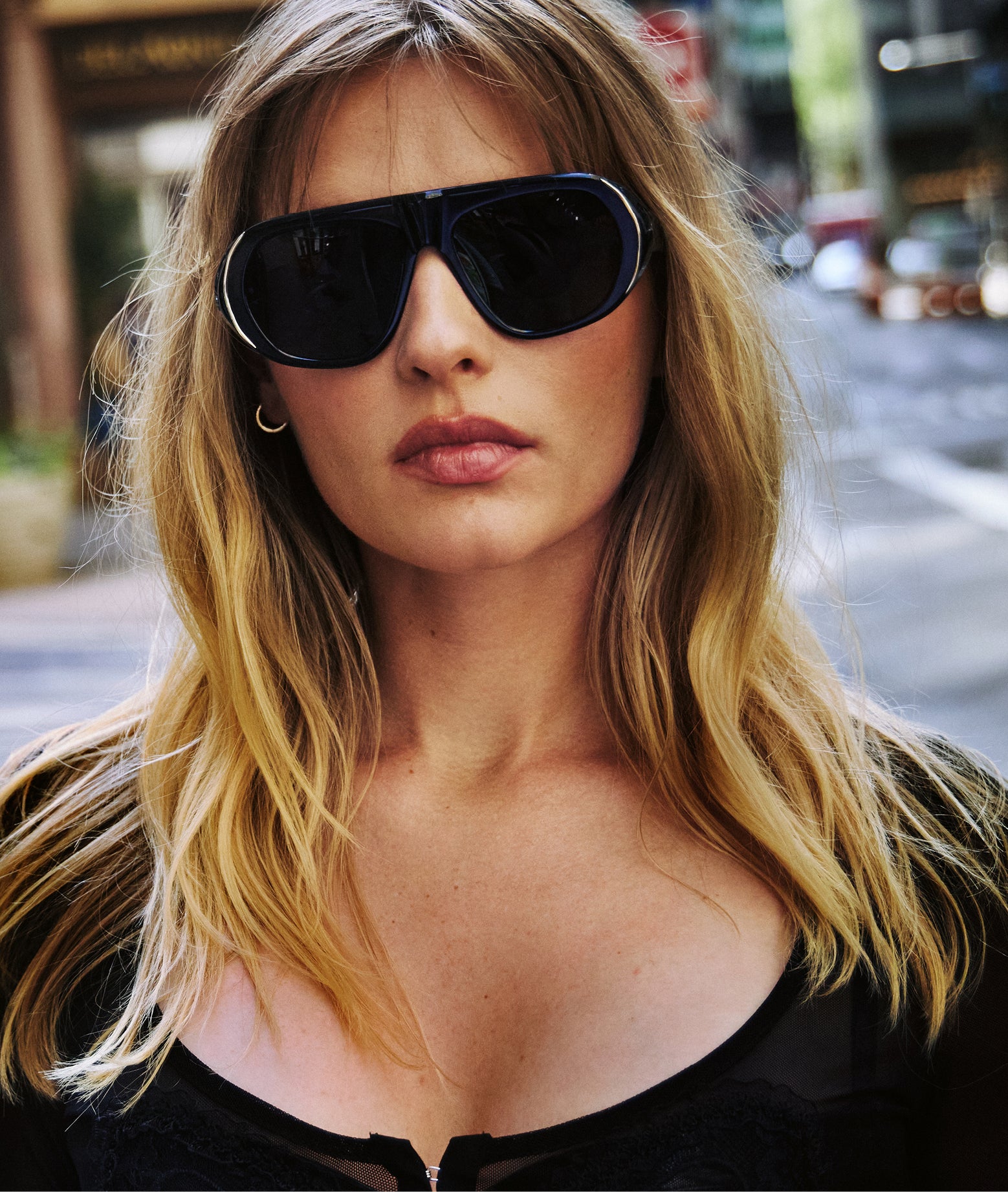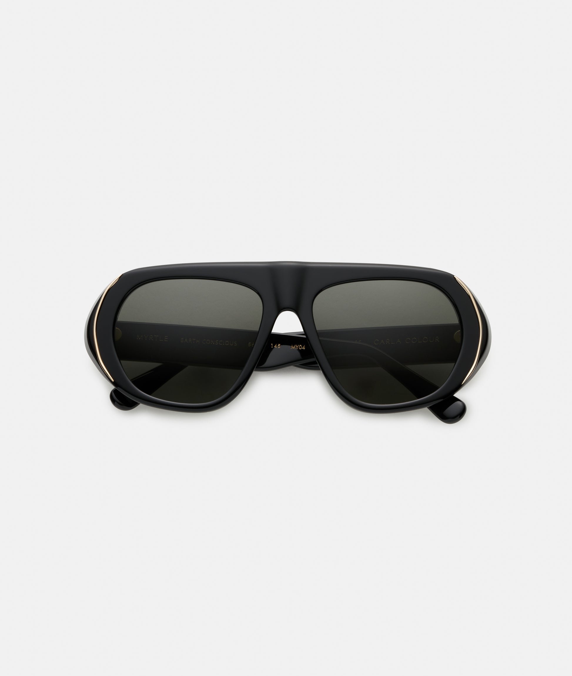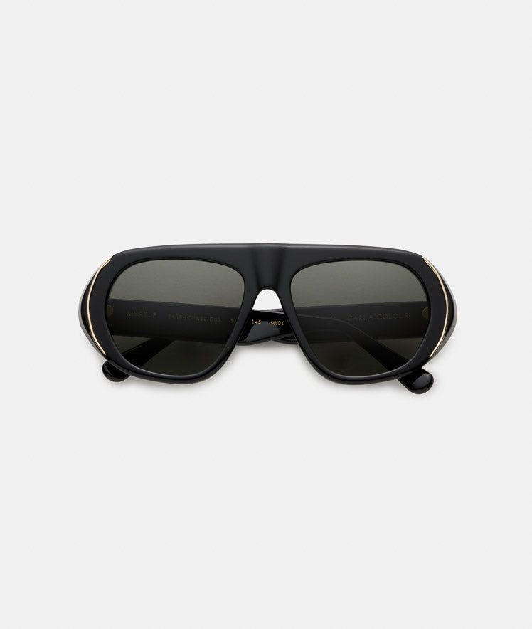 MYRTLE was inspired by Gena Rowlands' thespian character in the 1977 cult film Opening Night. This oversized geometric aviator frame with gold metal deco certainly delivers the drama.