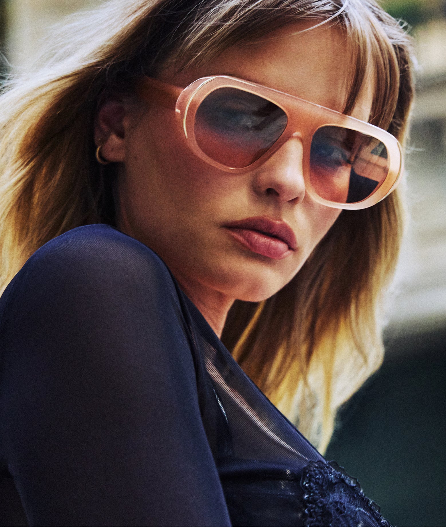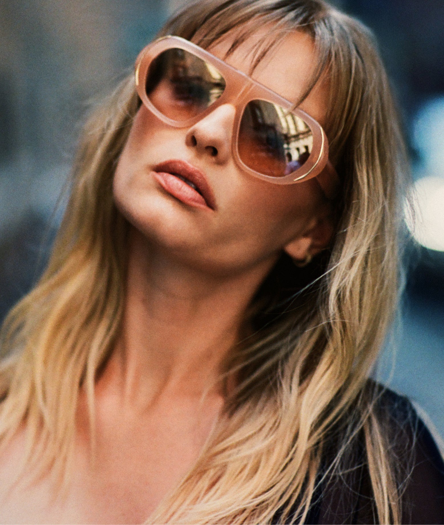 MYRTLE was inspired by Gena Rowlands' thespian character in the 1977 cult film Opening Night. This oversized geometric aviator frame with gold metal deco certainly delivers the drama.